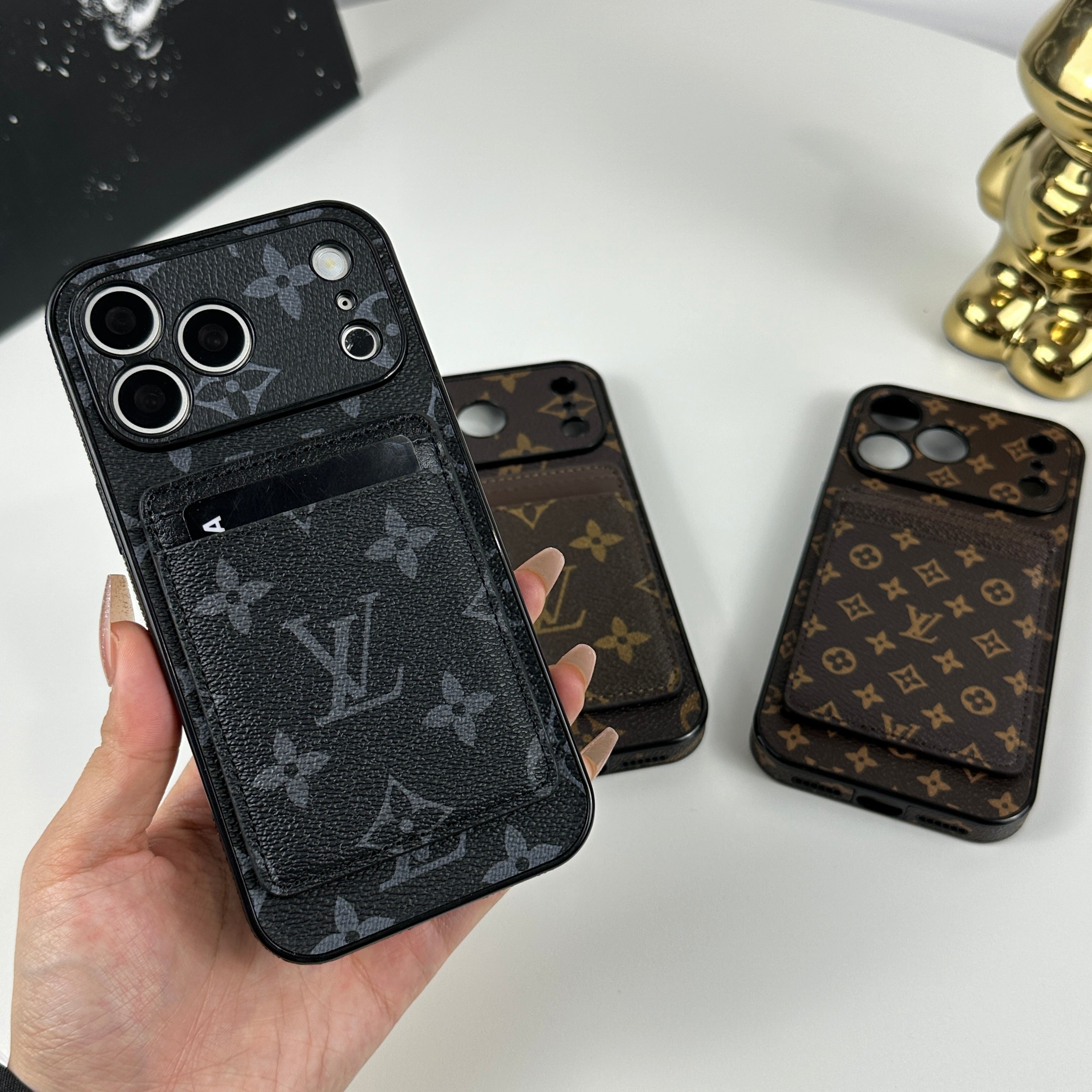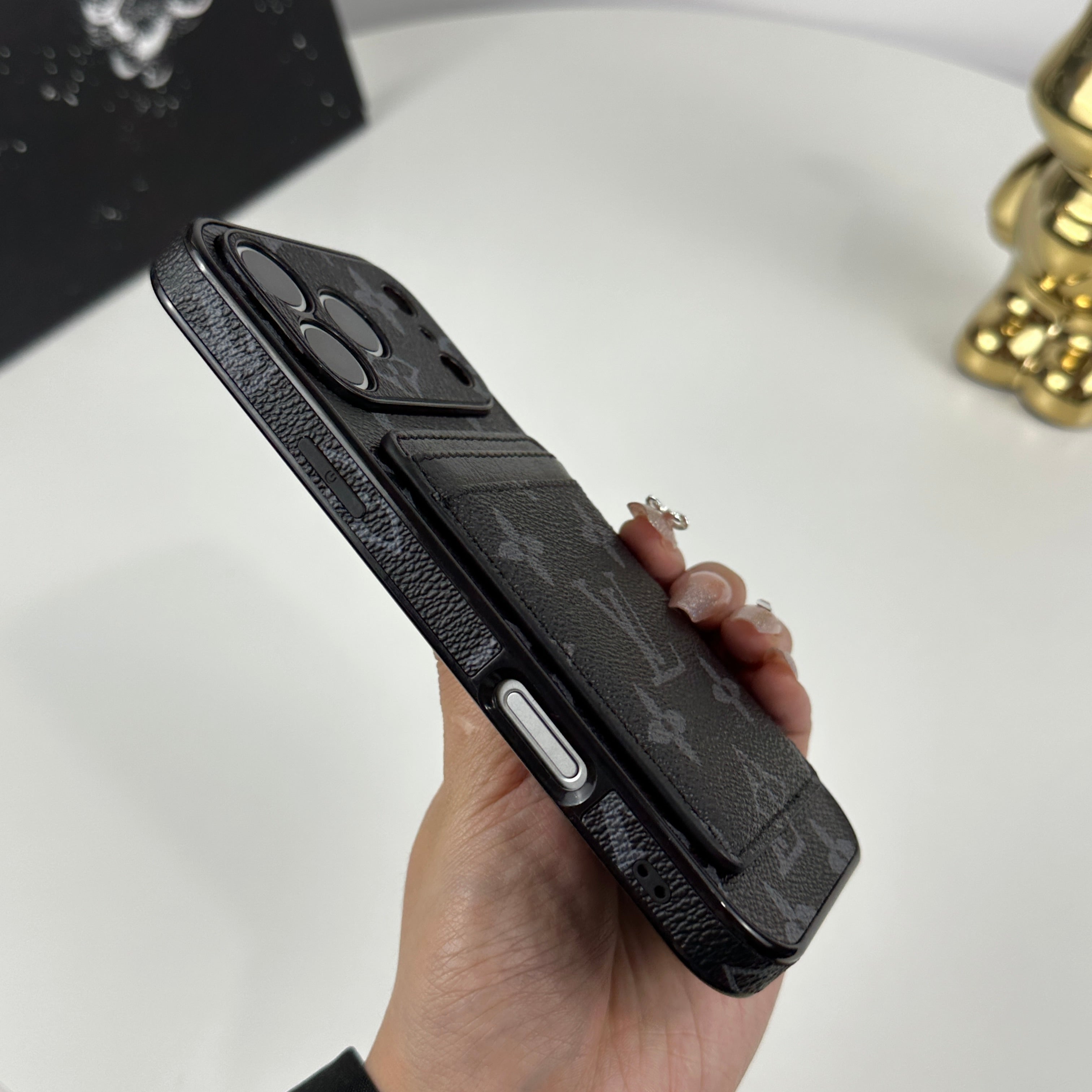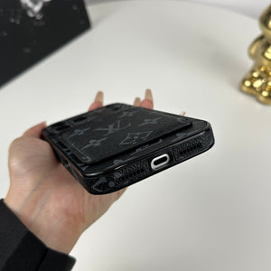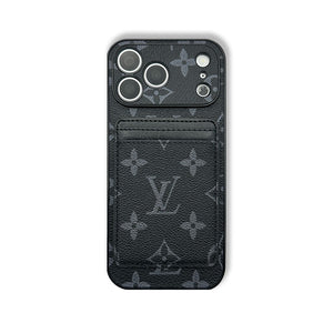 This elegant leather monogram iPhone case with a magnetic card holder features bold black printing and premium craftsmanship. Designed for the iPhone 17 Series, it offers secure protection, convenient card storage, and a refined luxury style.